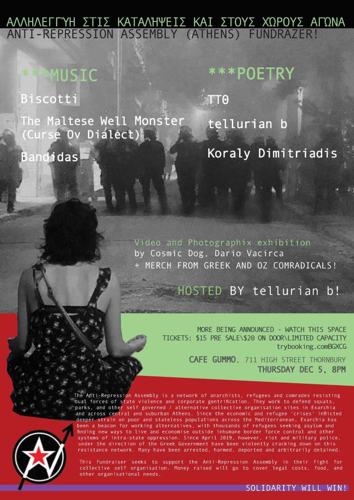Thanks so much for all who attended and contributed to the largesse we shall now bestow upon the Anti-Repression Assembly in Athens. They are super happy to know approx $2000 Oz dollars will be coming there way. Hopefully it helps them in some way in dealing with an horrendous situation and their struggle to counter it with self-organised projects and resistance.