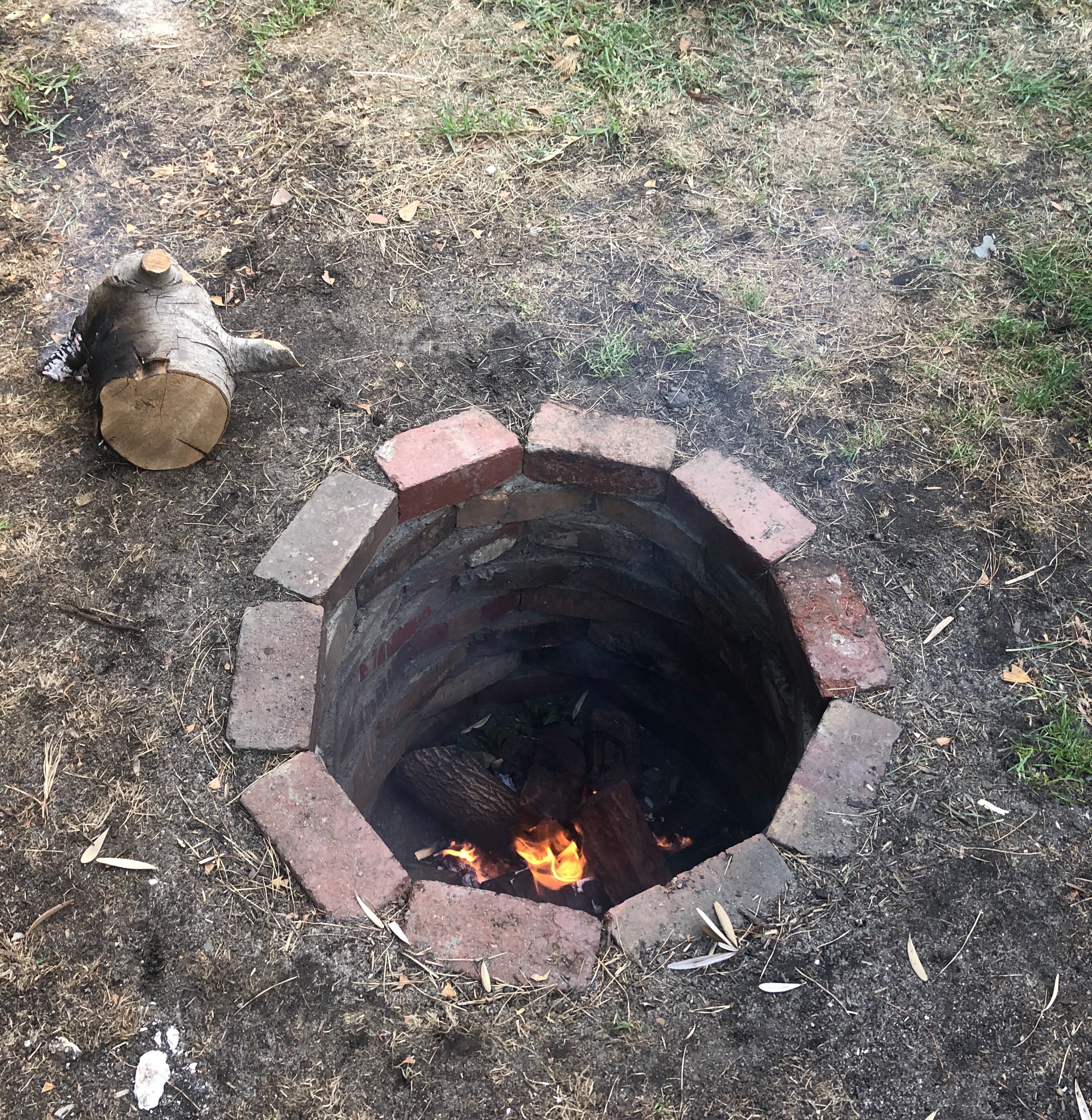 Made this amazing cooker in my backyard with best homies, Lucie and Alix. It can cook in layers- coal cooked banana leaf wrapped fish and spit meat skewers, grilled veggie skewers and other options. Top third will soon be covered with clay to allow for central/south Asian bread cooked directly on its surface. Works hungy style as well, with wrapped food cooked via hot stones in covered pit.